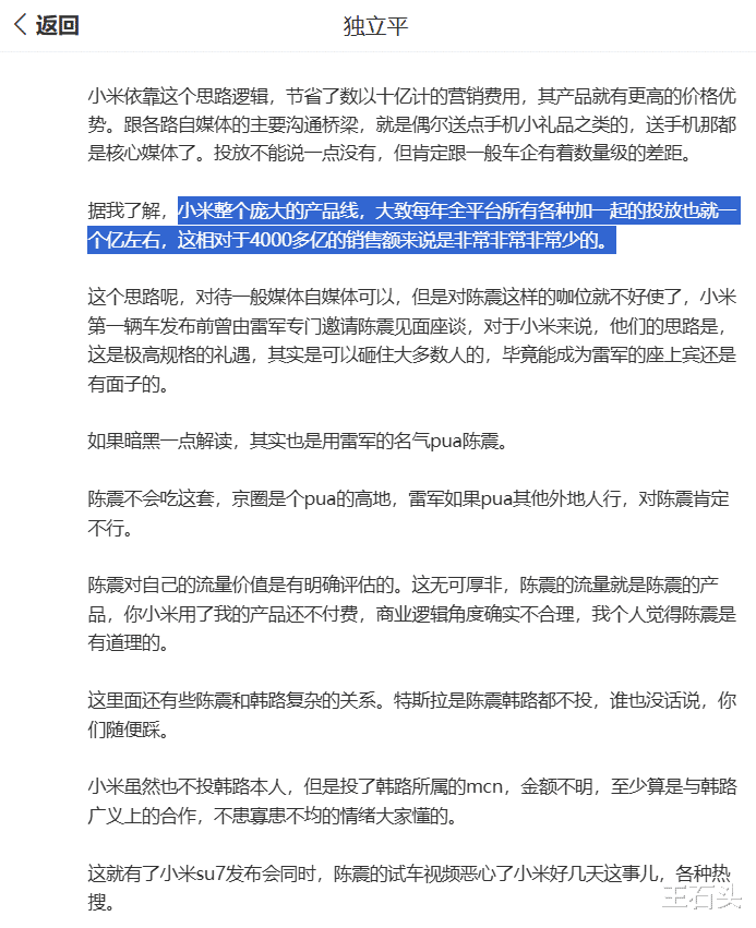 那个叫“独立平”的博主,据说是理记的小号,他说,小米整个公司,一年所有产品的营销费用全平台加起来,也就一个亿左右。