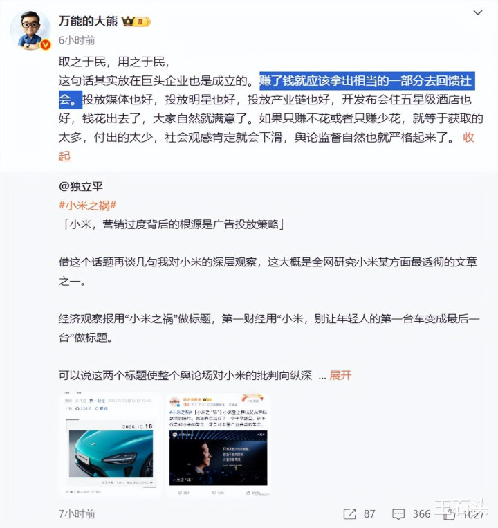 你比如那个大熊,直接喊话小米:“赚了钱要回馈社会,要多投广告、多投媒体、请媒体老师住五星级酒店。”